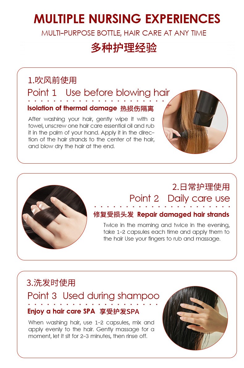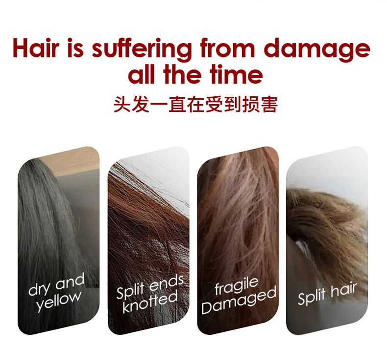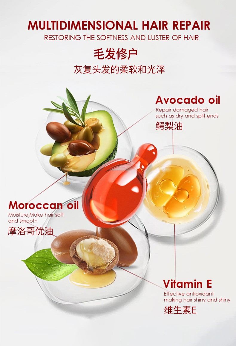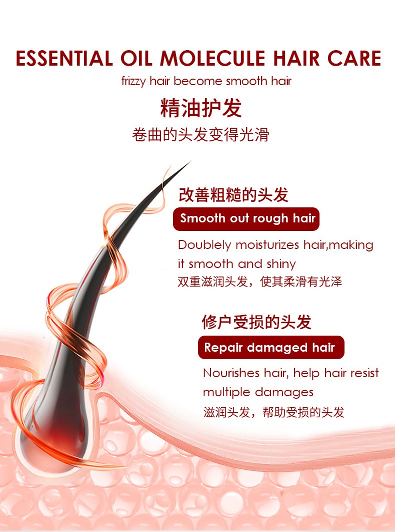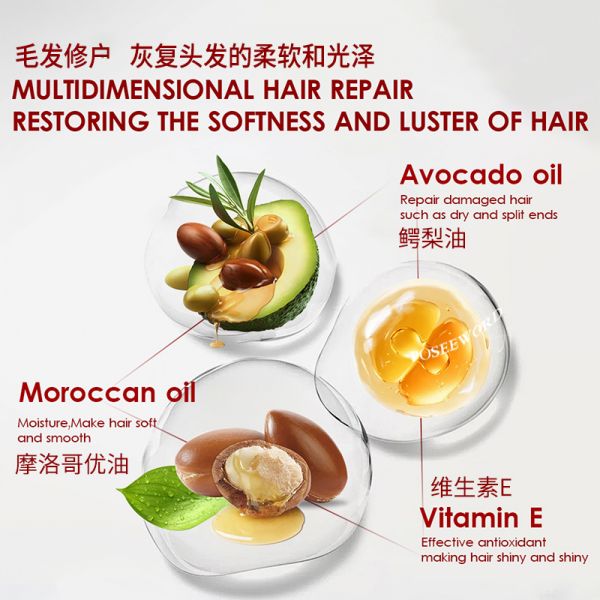 Contains Moroccan oil, Australian nut oil, avocado oil, combined with vitamins A, C, E and vitamin B5. It can deeply nourish hair, like applying a layer of nutrient film to hair, effectively improving dryness, splitting, reducing frizz, and making hair smooth and soft. It can also enhance hair toughness, resist daily damage, resist oxidation, maintain scalp health, create a good growth environment for hair, and after use, the hair will shine brightly and show healthy vitality.