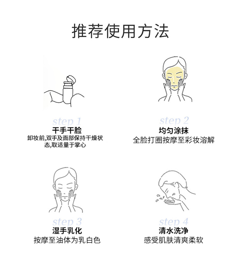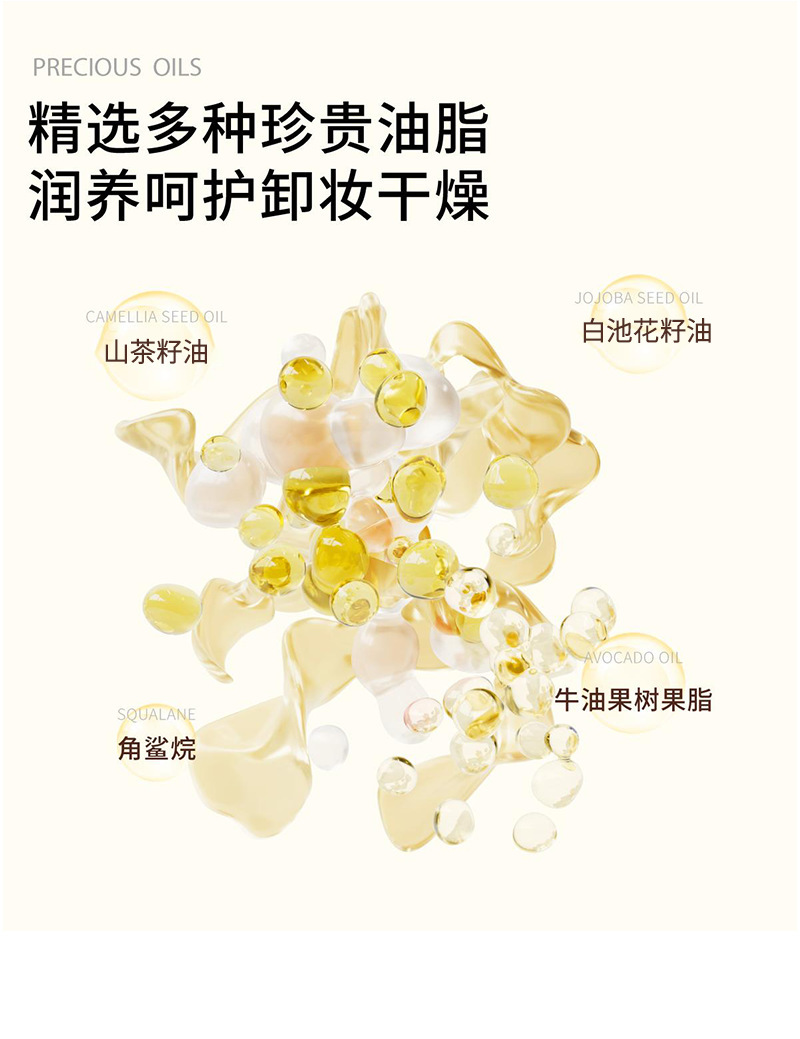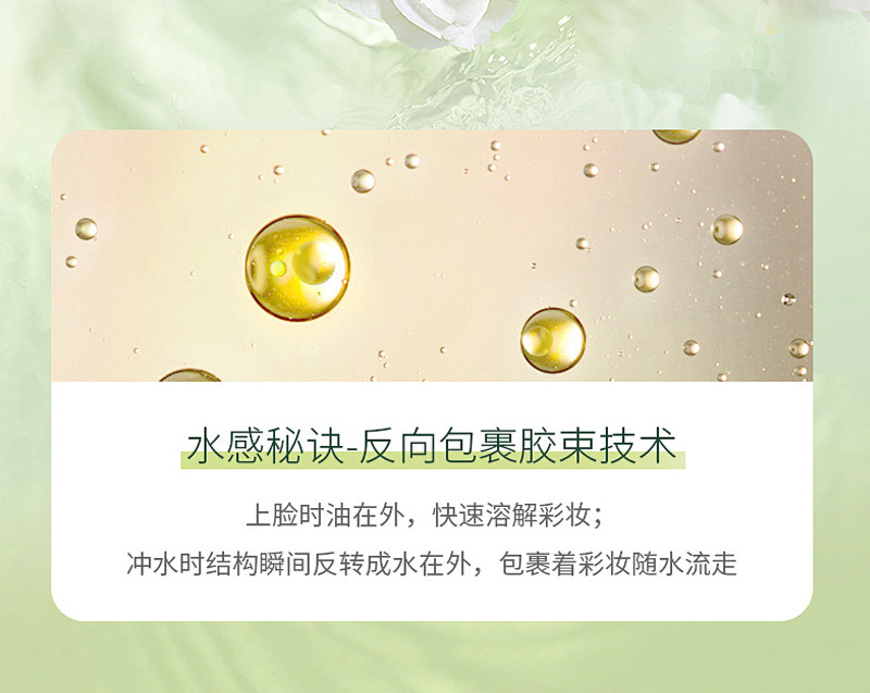 Contains various rare plant oils such as camellia seed oil, avocado fat, and squalane. A touch of easy to dissolve makeup, with strong makeup removal power but gentle and non irritating. At the same time, it deeply nourishes the skin, replenishes moisture, regulates water oil balance, strengthens the skin barrier, and leaves the skin hydrated and not tight after washing, revealing a refreshing, moisturized, and healthy glow.
